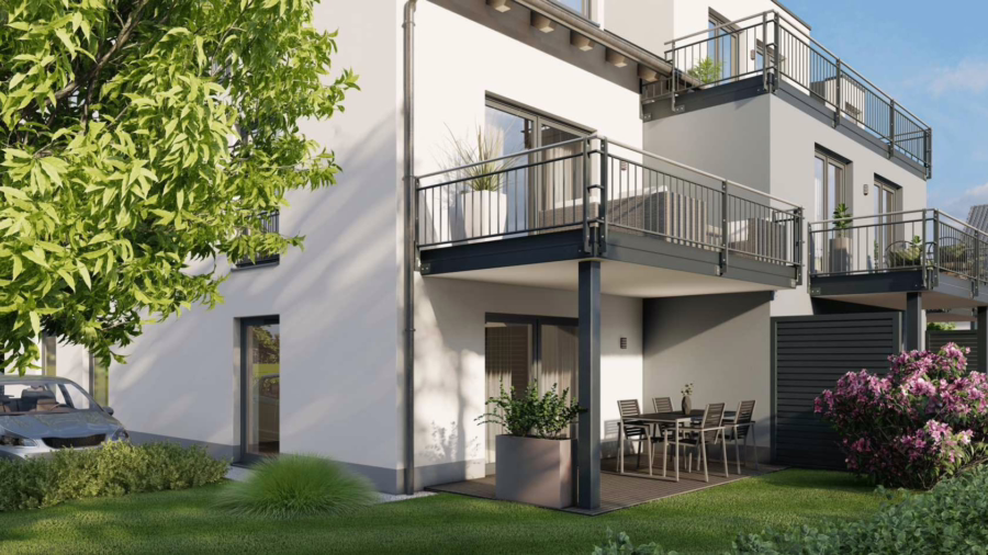 Die Erdgeschosswohnungen verfügen über eine überdachte Terrasse mit angrenzendem privaten Gartenanteil.