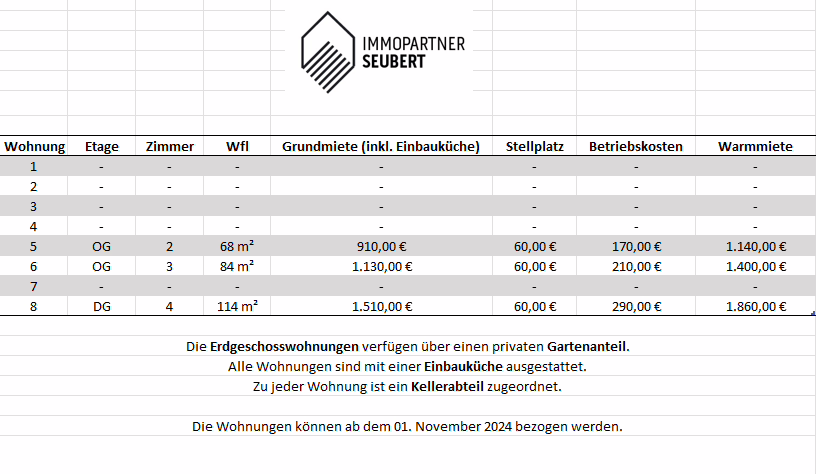 Die Neubauwohnungen können ab dem 01. November 2024 angemietet werden.