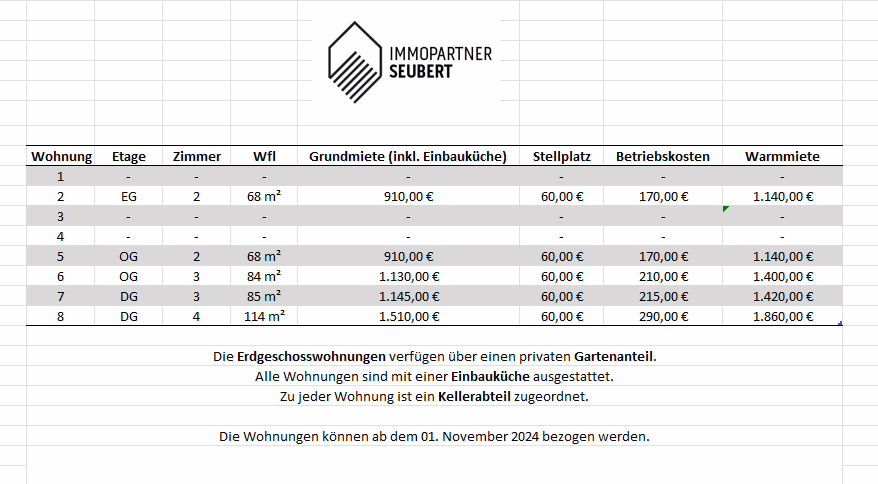 Die Neubauwohnungen können ab dem 01. November 2024 angemietet werden.