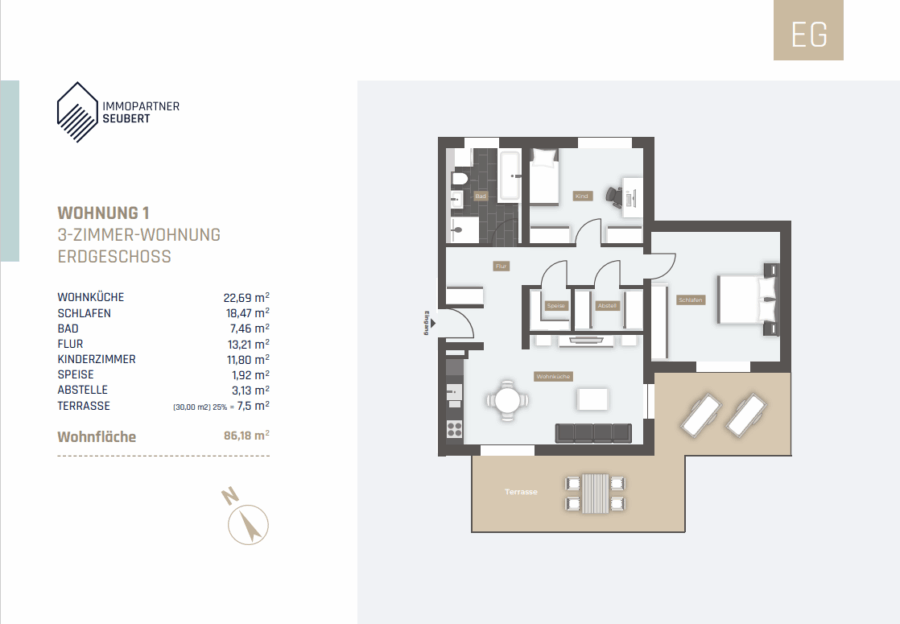 Die 3-Zimmer Erdgeschosswohnung zeichnet sich vor allem durch die große Terrasse mit direktem Zugang zum Garten aus. Des weiteren finden Sie einen Wohn/Essbereich mit offener Küche, ein Schlafzimmer und ein Kinderzimmer vor. Das Bad ist mit einem Tageslichtfenster, einer Fußbodenheizung und einer Dusche ausgestattet.