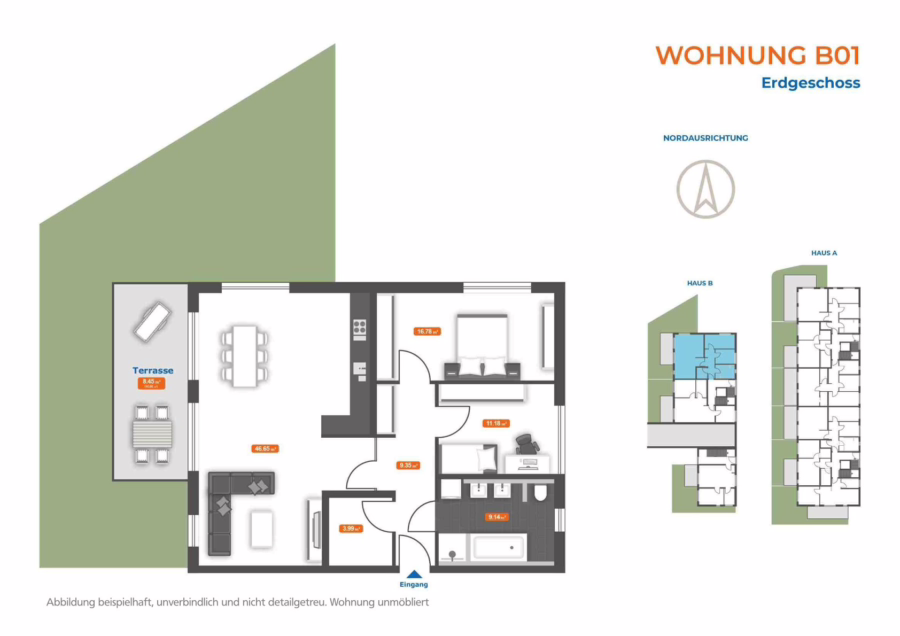 Das Neubauprojekt umfasst insgesamt 33 barrierefreie Wohneinheiten mit Aufzug, aufgeteilt auf das Haus A und B mit Tiefgarage und Außenstellplätzen. Alle Erdgeschosswohnungen verfügen über eine großzügige Terrasse mit eigenem Gartenanteil. Die Etagenwohnungen, die sowohl über das Treppenhaus, als auch über den Aufzug erreicht werden können sind mit einem Balkon oder einer großzügigen Dachterrasse ausgestattet.