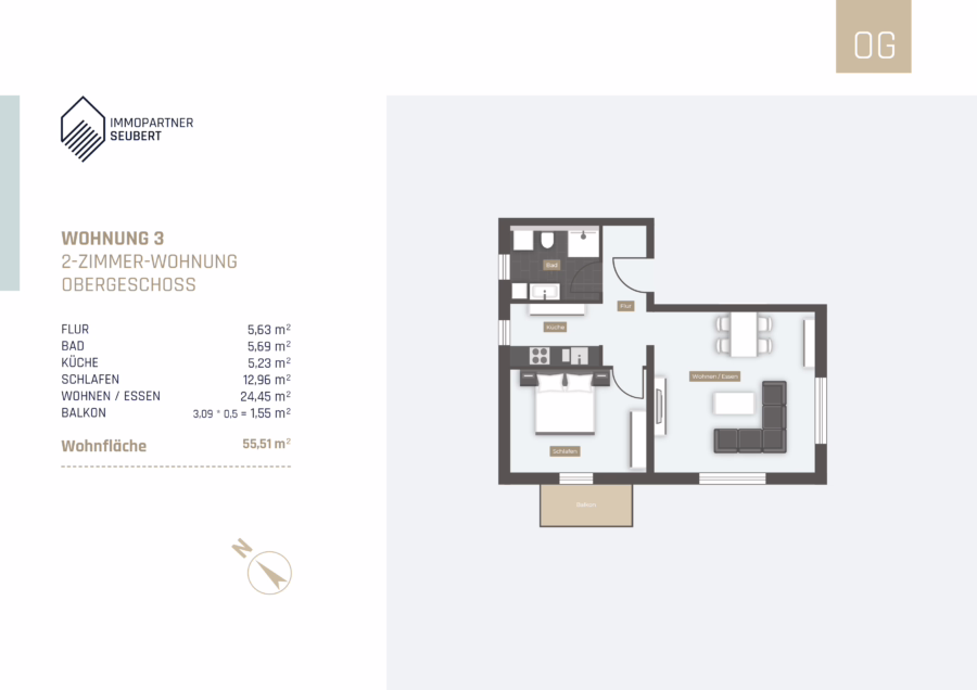 Die 2-Zimmer Wohnung mit einer Wohnfläche von ca. 56 m² teilt sich auf den Wohn-/Essbereich, das Schlafzimmer, die Küche und das moderne Bad auf. Auf dem Balkon hat ein großer Tisch mit Bestuhlung problemlos Platz hat.