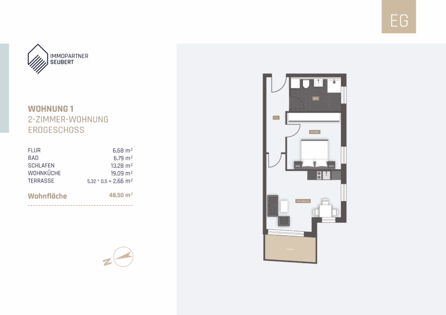 Die ca. 49 m² große Erdgeschosswohnung teilt sich auf den Wohn/Essbereich mit offener Küche und angrenzendem Balkon, sowie auf das Schlafzimmer und das Bad mit Tageslichtfenster auf.
