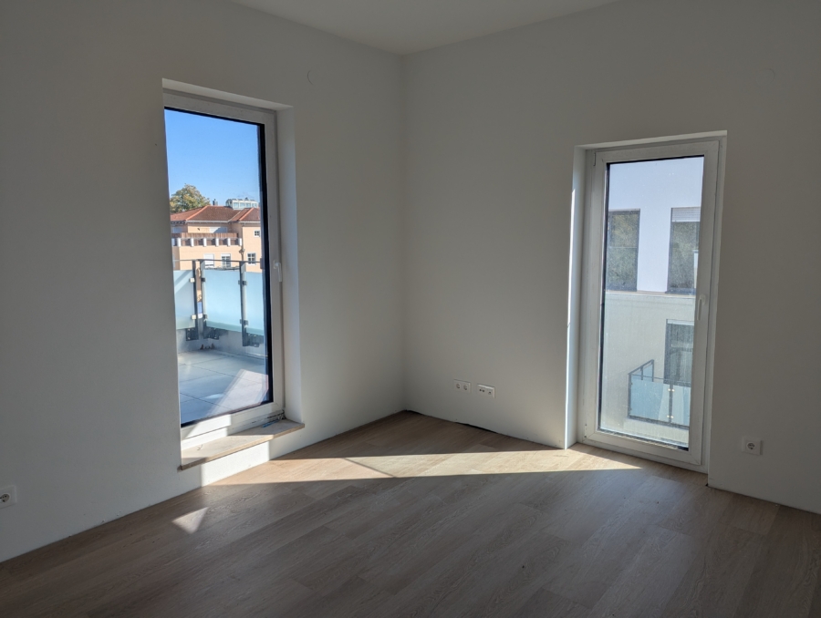 Das Penthouse teilt sich auf den großen Wohn/Essbereich mit offener Küche, sowie einem Schlafzimmer und einem Kinderzimmer/Büro auf. Das Tageslichtbad ist mit einem Fenster und einer Dusche ausgestattet. Ein Highlight ist die ca. 30 m² große Dachterrasse mit einmaligem Blick über die Dächer von Straubing. Eine moderne Einbauküche wird eingebaut.